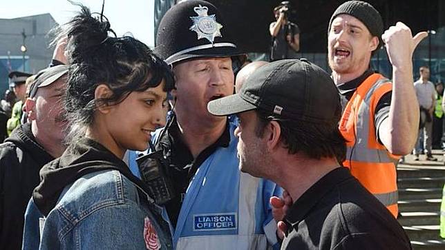 Dalam foto yang beredar di medsos, Saffiyah terlihat berdiri dengan satu tangan di saku celananya. Ia tampak tersenyum sambil menatap marah kepada pemimpin EDL, Ian Crossland, yang datang ke kota dengan lebih dari 20 pendemo.
